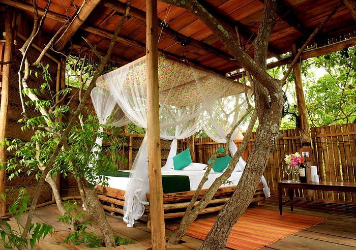 Rustic luxury with treehouses & mud chalets set in natural surroundings. A good balance of comfort and simplicity, nature immersion, eco practices, and proximity to parks.